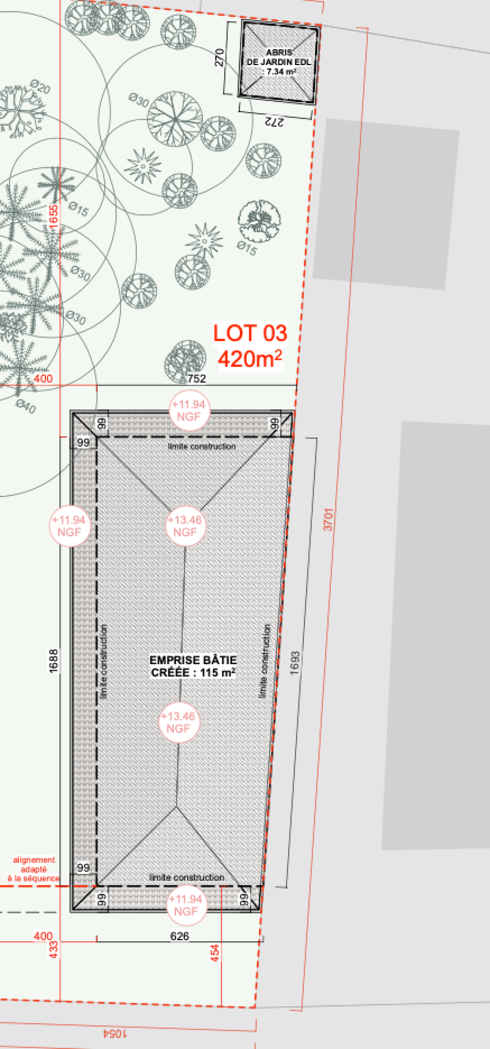 Terrain de 420m2 à vendre avec permis de construire pour une maison de plain pied de type 4 de 84m2 avec garage.
